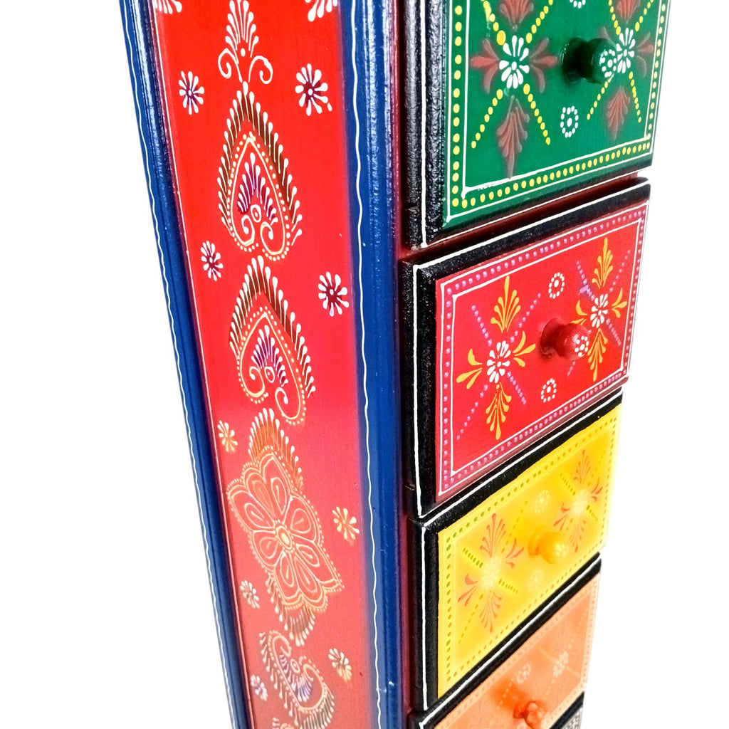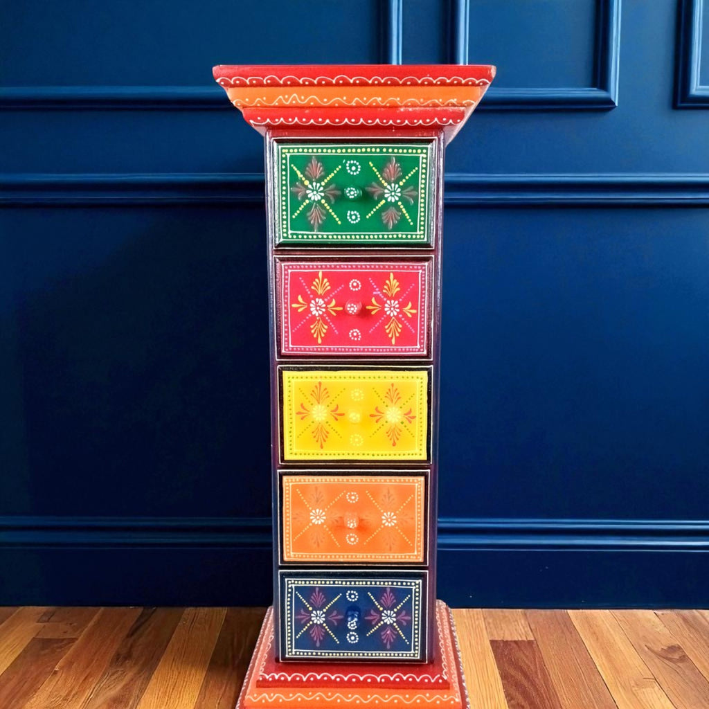 Measuring at an ideal size, this versatile piece fits seamlessly into corners or against walls, making it perfect for maximizing space in your living room, bedroom, or hallway. The five spacious drawers offer ample storage for a variety of items, from clothing and accessories to documents and keepsakes. Each drawer glides smoothly on durable metal runners, ensuring easy access to your belongings. The handcrafted details highlight the skill of our artisans, making this almirah a unique statement piece in your home.