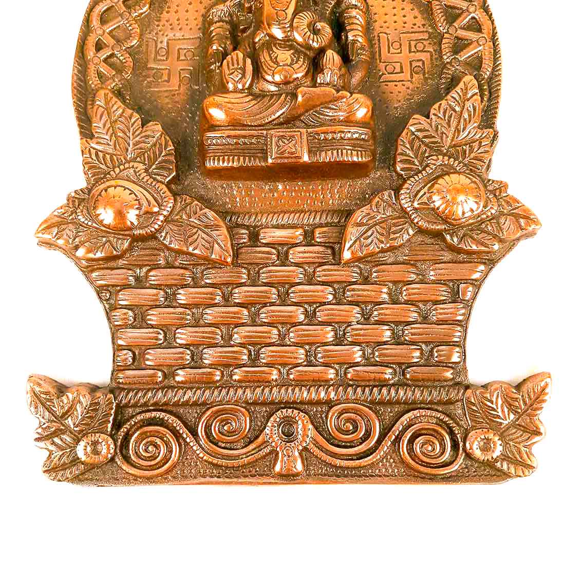 The focal point of this intricately designed piece is the revered deity, Lord Ganesha, also known as Ganpati. His divine presence graces your living room, infusing it with a sense of tranquility and positivity. The carefully crafted details of the idol capture the essence of Lord Ganesha's wisdom, knowledge, and prosperity, making it a symbol of auspiciousness that resonates with any living environment. The inclusion of swastik signs alongside the Lord Ganesha figurine further enhances the spiritual significance of this wall decor. Swastik, an ancient symbol of well-being and positive energy, radiates blessings and harmony into your living space.