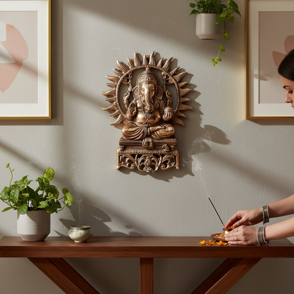Designed to suit home entrances, pooja rooms, living rooms, offices, and vastu spaces, the detailed metal craftsmanship and refined finish make it a graceful addition to any interior style. Its compact yet striking presence helps elevate the spiritual and aesthetic appeal of walls without overwhelming the décor.