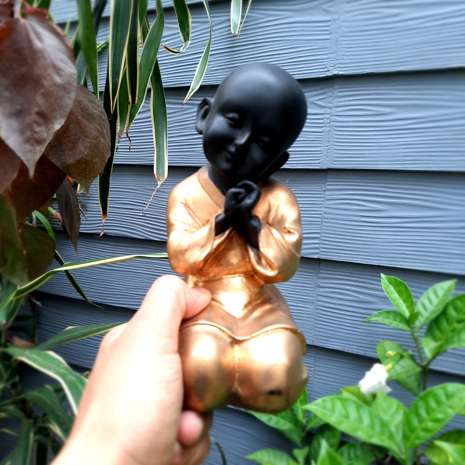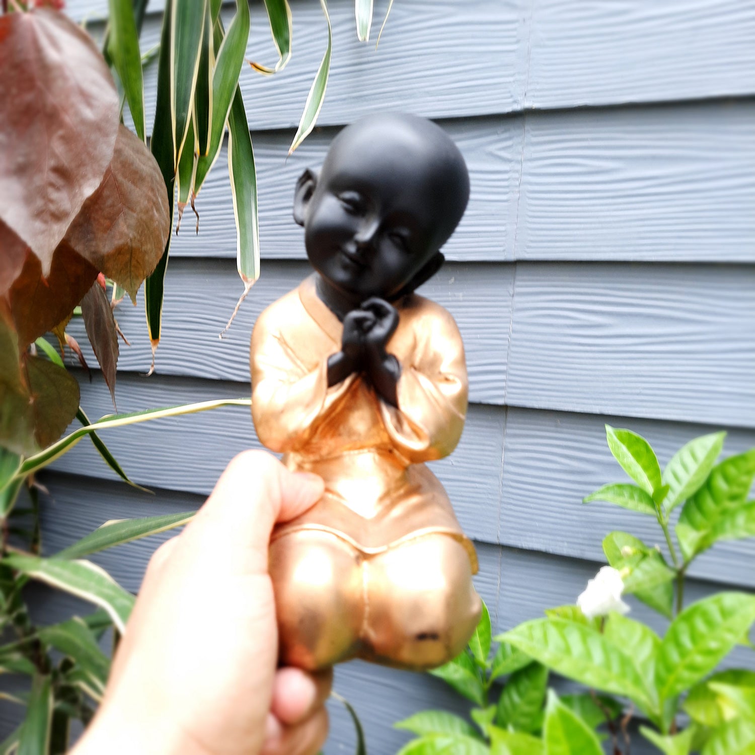 Made with high-quality materials, it exudes a sense of timeless beauty that can complement a variety of interior styles, from traditional to modern. The Baby Monk's serene expression and gentle posture create a calming ambiance, making it a perfect choice for both indoor and outdoor spaces. Its compact size allows for versatile placement - on a shelf, mantel, side table, or even nestled among your garden blooms.