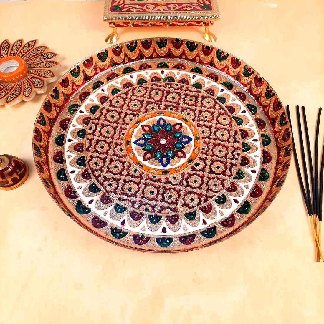 Made from durable and high-quality steel, this plate is adorned with intricate Meenakari work, which is a traditional art form that involves colourful enamel painting on metal surfaces. The Meenakari detailing showcases a burst of vibrant hues that symbolize the joy and festivity associated with various occasions like Diwali, Rakhi, Rakshabandhan, Karwachauth, Ganesh Chaturthi, and more. The plate's captivating design adds an aesthetic appeal to your mandir or prayer space, enhancing the spiritual ambiance.