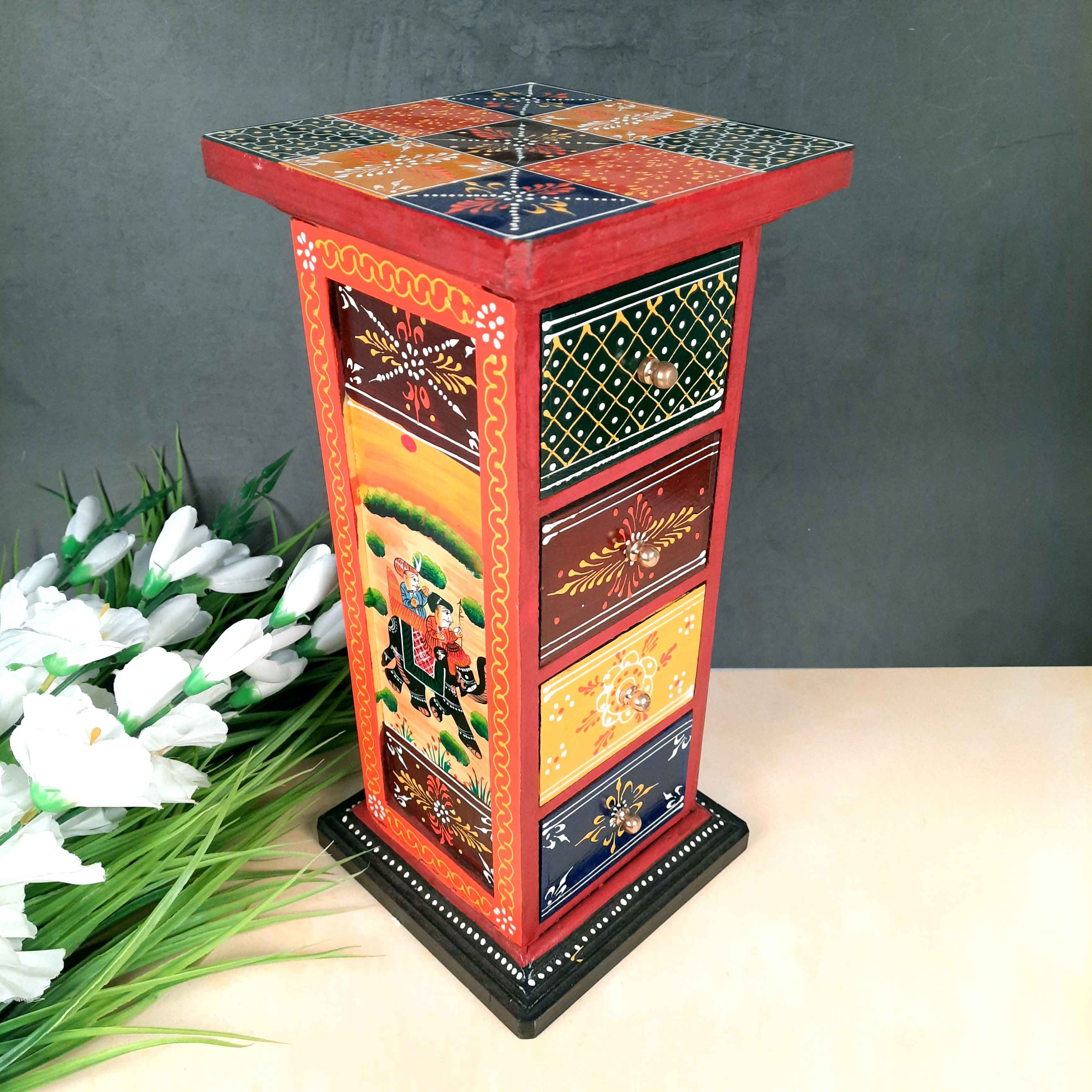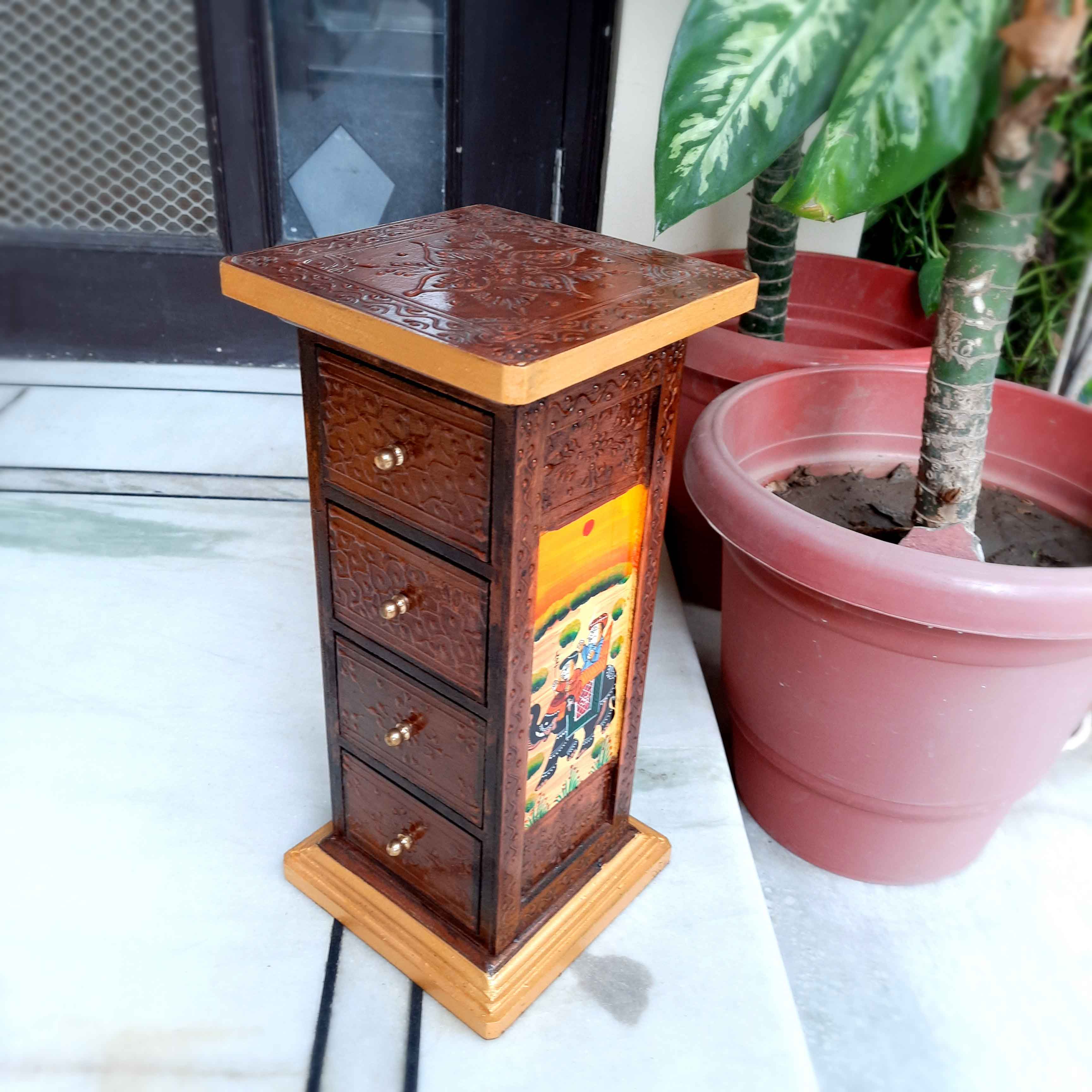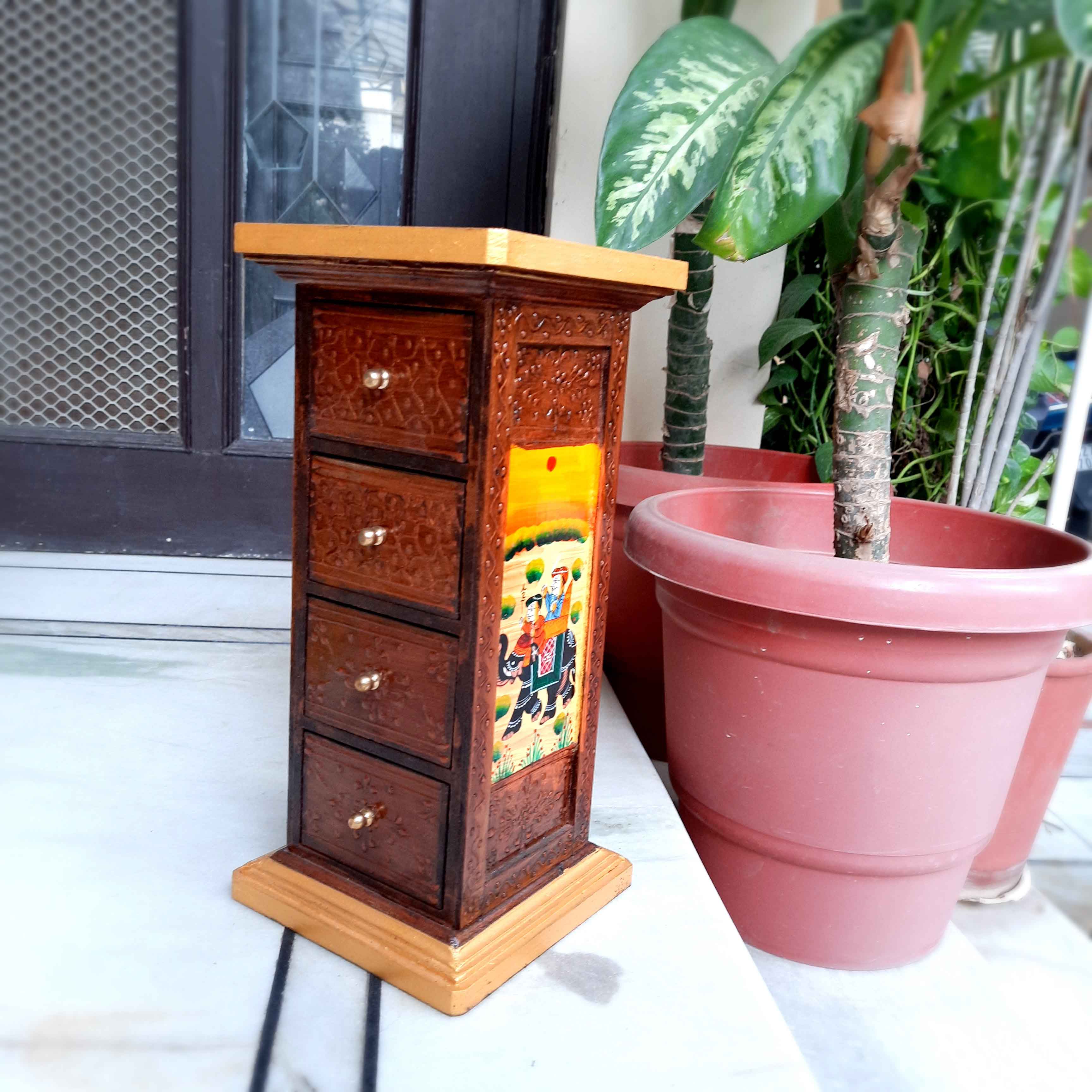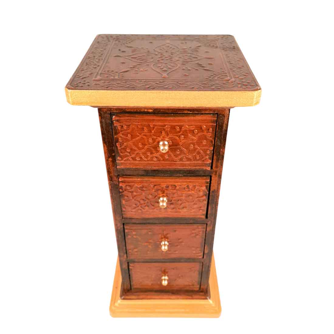 Description: Looking for something to fill up that corner space. We have just the right thing for you. The four drawer corner stand is the perfect solution when you have to save space and store things at the same time. The traditional beauty and intricacy of the designs on it give you the Indian vibes while being utterly cool at the same time. Store your precious jewelry in style with this 15 inch decorative box. Luxurious and chic, with 4 drawers for organizing jewelry, it's the perfect way to keep your earrings, necklaces, and other small items safe and organized! Add a hint of glamour to your home. What are you waiting for?
