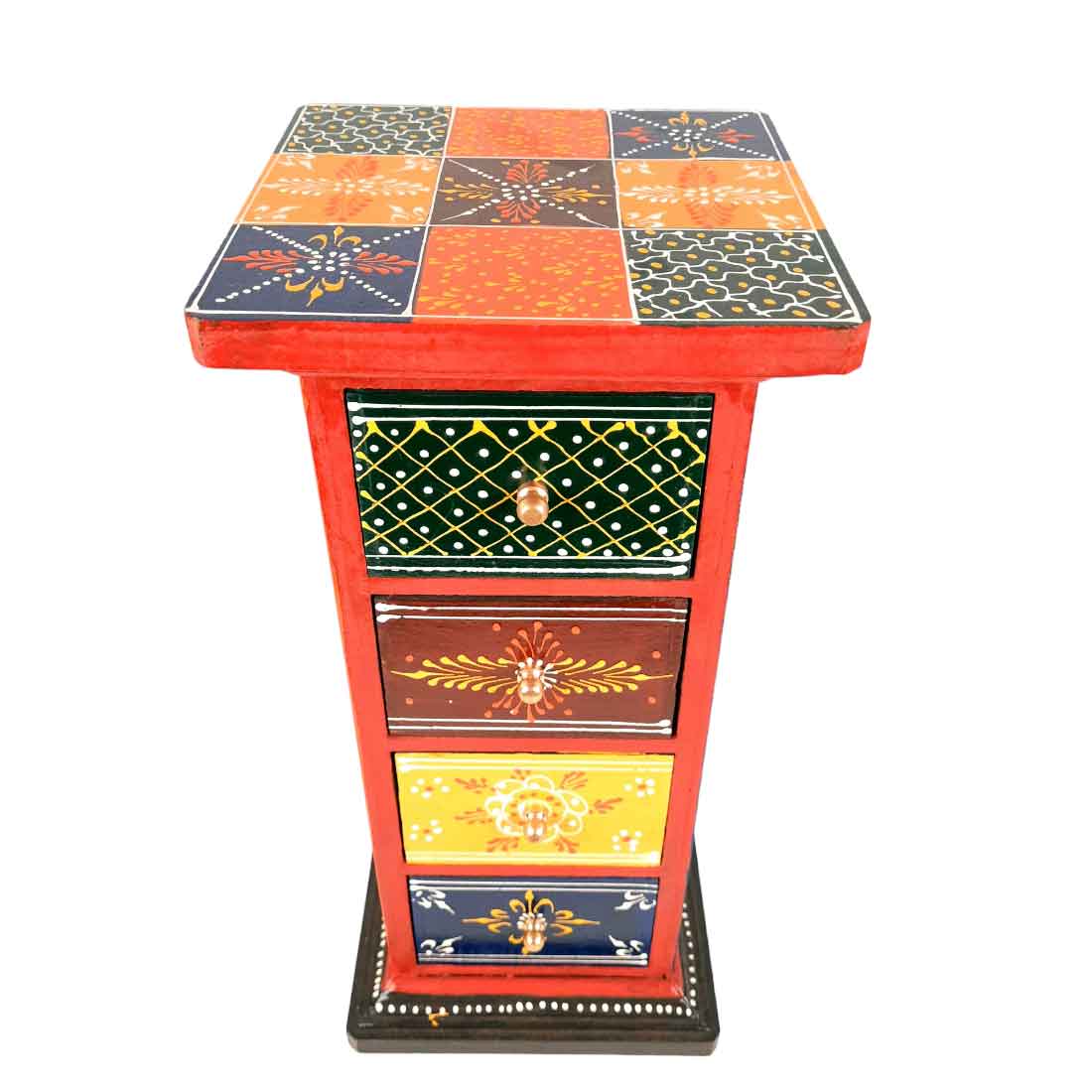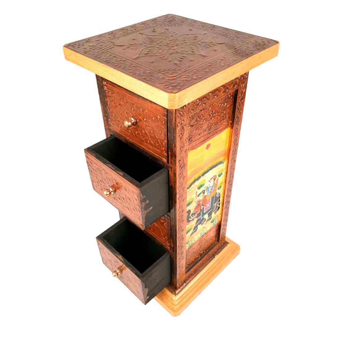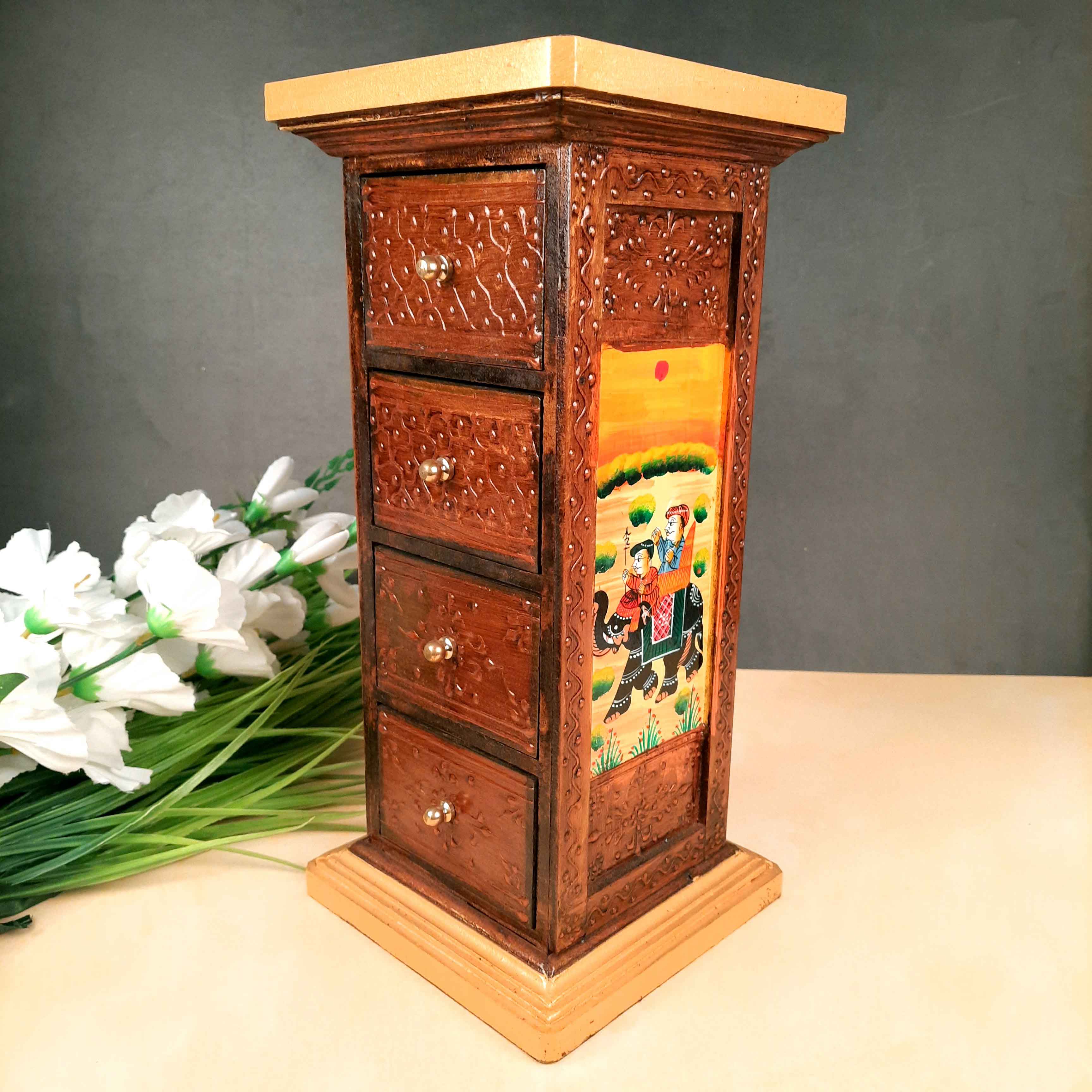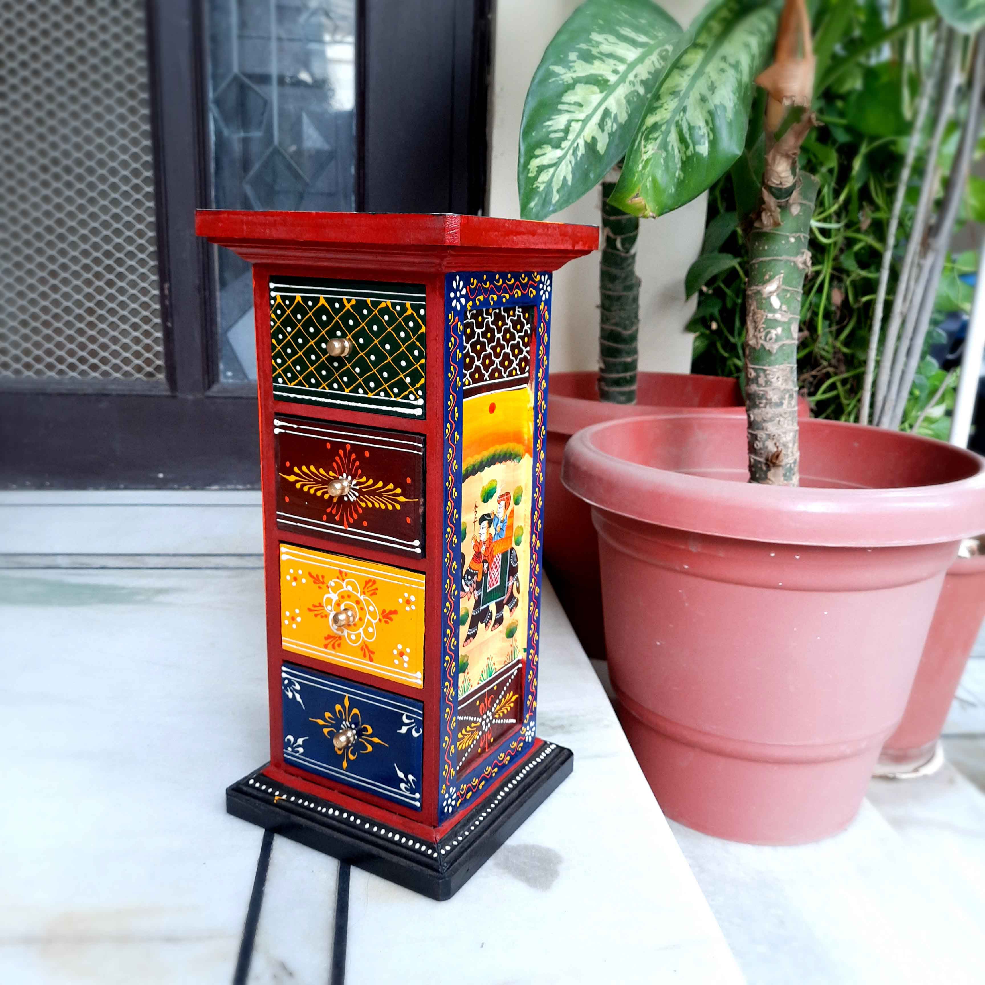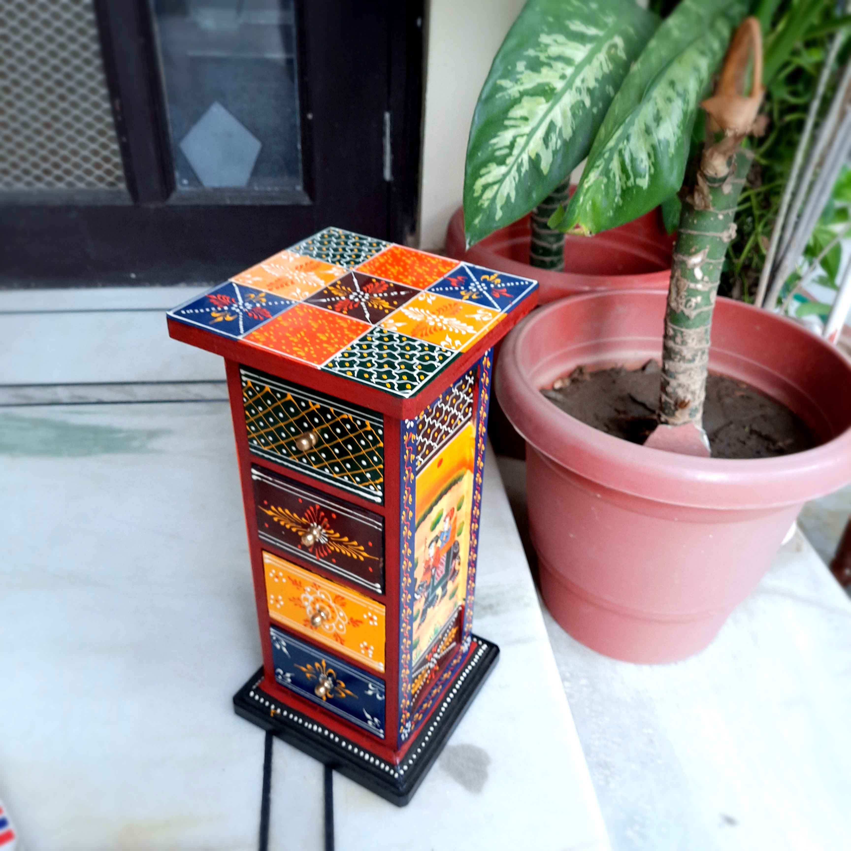 Description: Looking for something to fill up that corner space. We have just the right thing for you. The four drawer corner stand is the perfect solution when you have to save space and store things at the same time. The traditional beauty and intricacy of the designs on it give you the Indian vibes while being utterly cool at the same time. Store your precious jewelry in style with this 15 inch decorative box. Luxurious and chic, with 4 drawers for organizing jewelry, it's the perfect way to keep your earrings, necklaces, and other small items safe and organized! Add a hint of glamour to your home. What are you waiting for?
