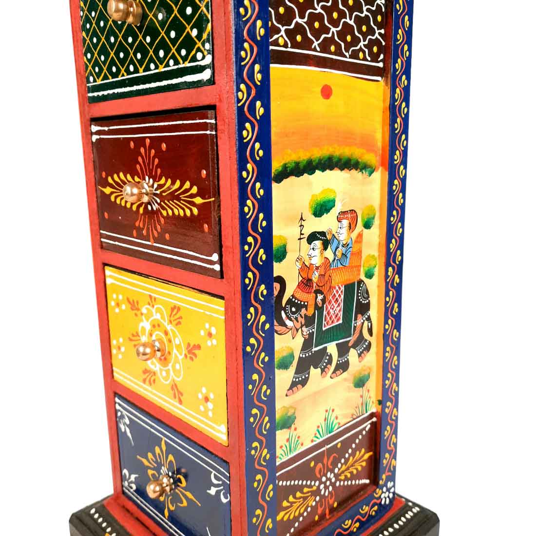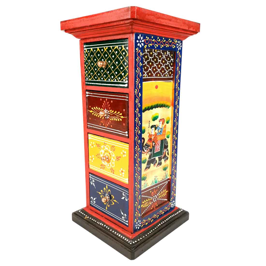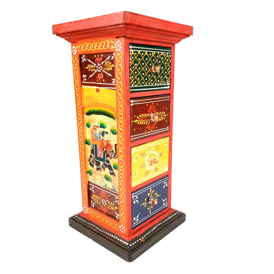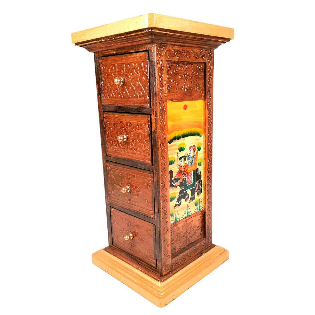 Description: Looking for something to fill up that corner space. We have just the right thing for you. The four drawer corner stand is the perfect solution when you have to save space and store things at the same time. The traditional beauty and intricacy of the designs on it give you the Indian vibes while being utterly cool at the same time. Store your precious jewelry in style with this 15 inch decorative box. Luxurious and chic, with 4 drawers for organizing jewelry, it's the perfect way to keep your earrings, necklaces, and other small items safe and organized! Add a hint of glamour to your home. What are you waiting for?