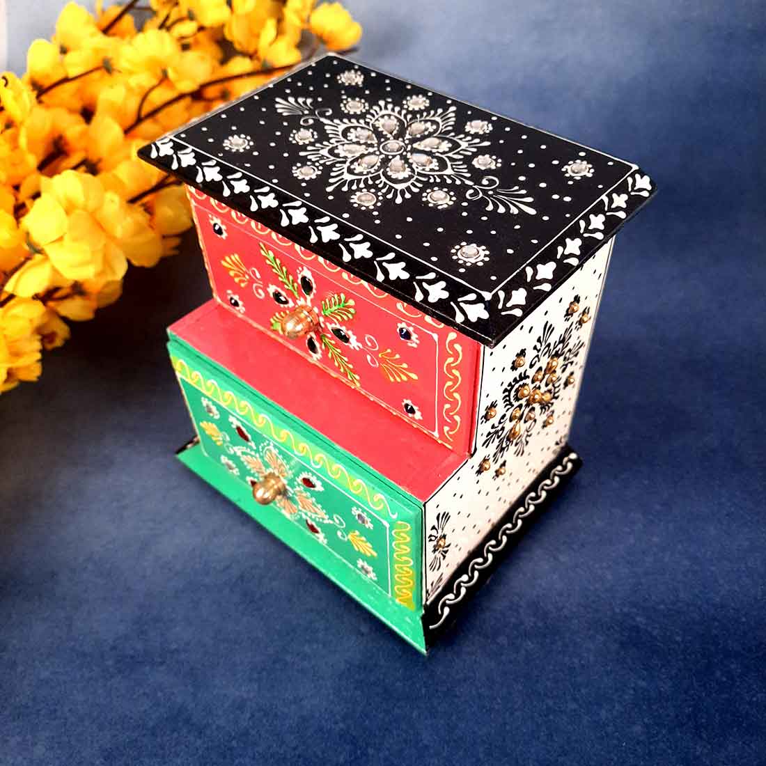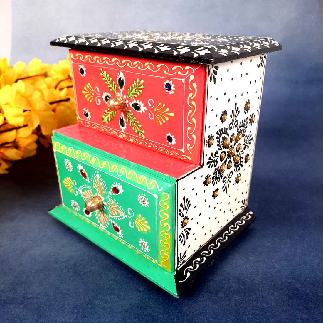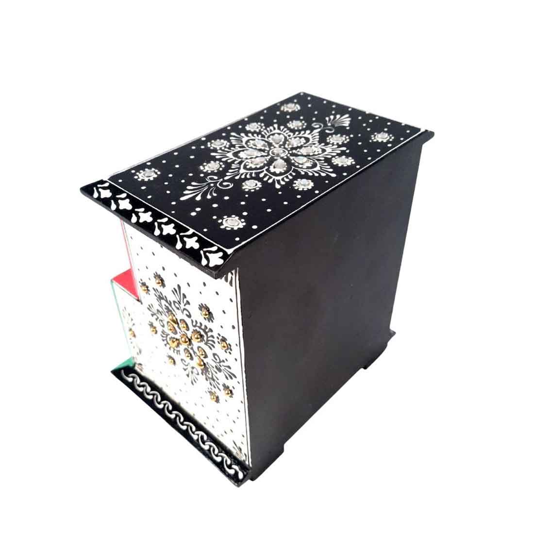 Apkamart has crafted together sturdy wood and delicate ceramic to create this beautiful drawer style jewellery box. This handcrafted drawer set is hand painted with each ceramic drawer painted to be unique from the others. If you feel due to the ceramic it's a little fragile to be used as a jewellery box you can use it a centrepiece for your table and store mouth fresheners and mints for guests to be served, post meals. This piece is multifaceted in its uses and you can use in various creative ways. It also makes for a great gift. A quality product with stunning visual appeal this 4 Drawer Jewelry Box is definitely a winner.