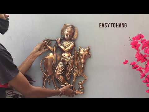 Experience a transcendent connection through the captivating "Krishna Playing Flute Wall Hanging." This exquisite work of art, measuring 22 inches, intricately fashioned from metal, captures the serene essence of Lord Krishna in the midst of pure bliss as he engages in the melodious act of playing his flute. The depiction is further enriched by the presence of a graceful cow, standing beside the divine figure, epitomizing the deep and harmonious bond shared between them. At its core, this portrayal embodies the profound and timeless relationship between Radha and Krishna, serving as a profound symbol of boundless love and unwavering devotion.
