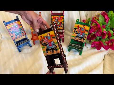This set of two green wooden folding chair mobile holder showpieces brings a fresh, nature-inspired energy to any desk arrangement. The miniature folding chair in vibrant green with figure painting detailing creates a lively, colourful phone stand that holds your device at a perfect viewing angle while adding artisan botanical character to the workspace. The set of two makes it ideal for pairing on a shared desk, gifting to a couple, or keeping one and giving one.