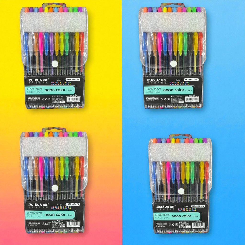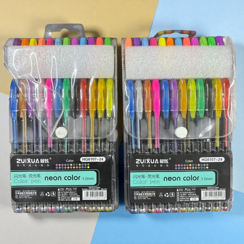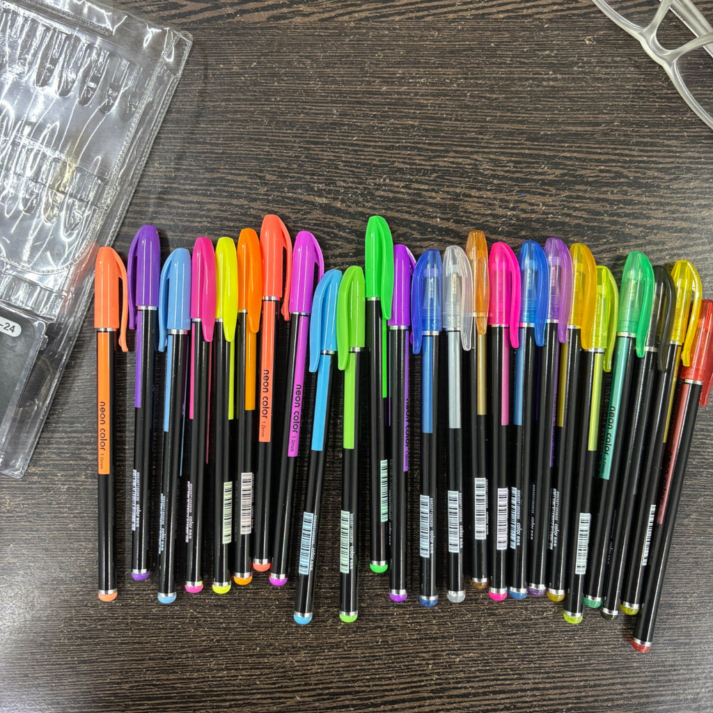 Set of 24 Neon Gel Pens: Includes bright, fluorescent ink shades for vivid coloring and highlighting.