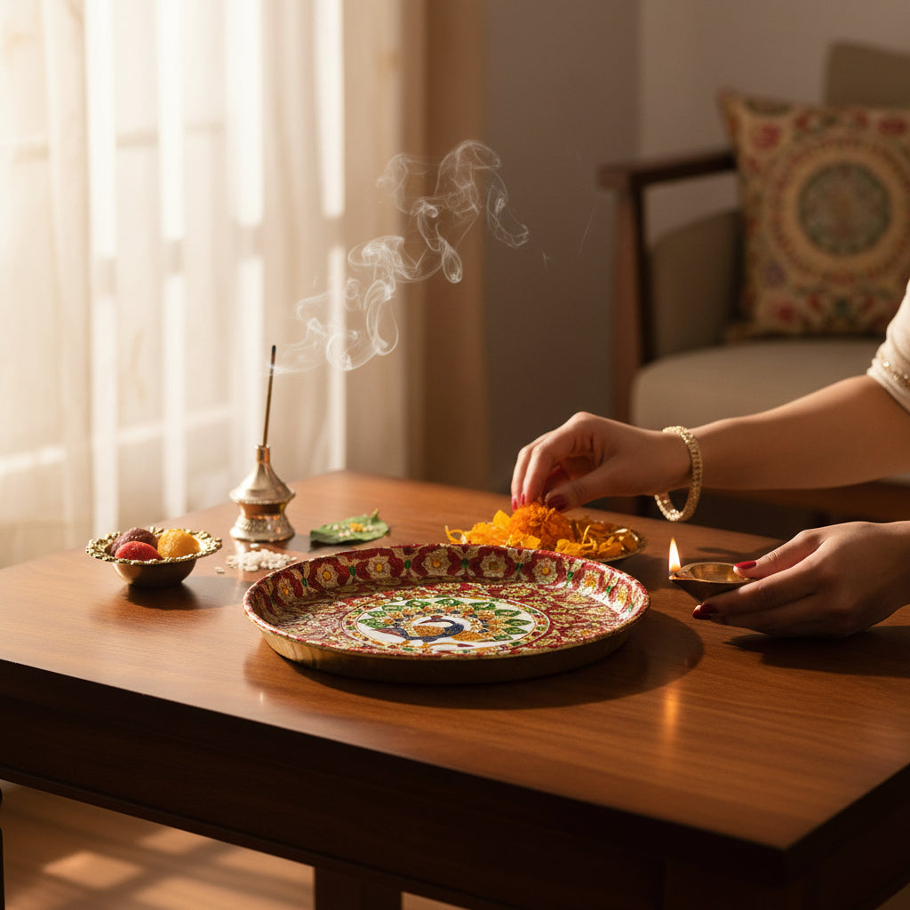 Designed for durability and easy maintenance, this pooja thali for home mandir is lightweight, easy to clean, and suitable for repeated use during festivals and religious functions. It also makes a thoughtful gift for Diwali, Karwa Chauth, housewarming, weddings, and religious ceremonies, reflecting devotion and traditional beauty.