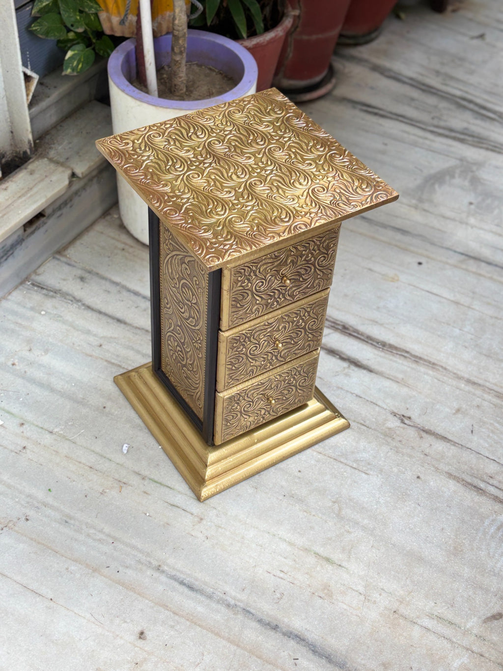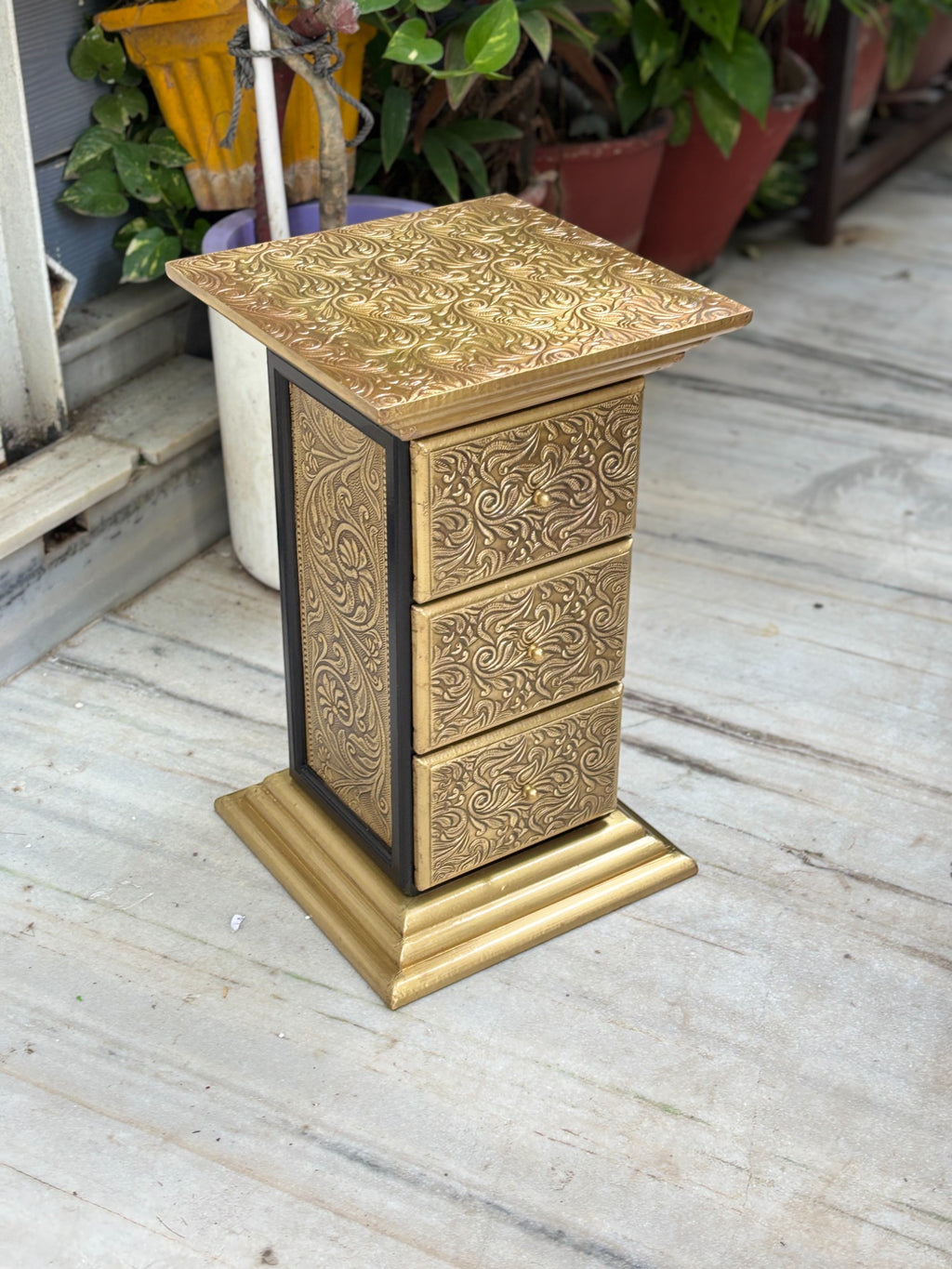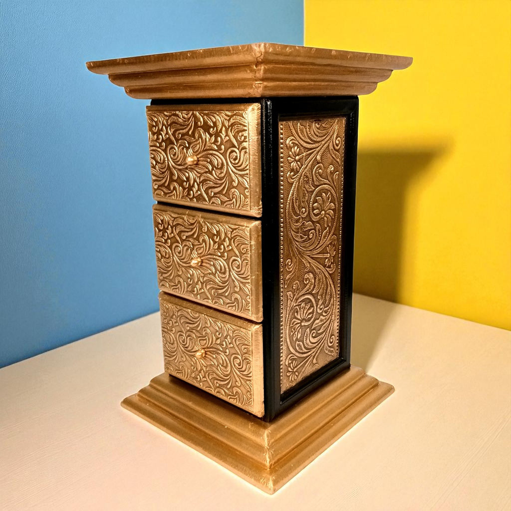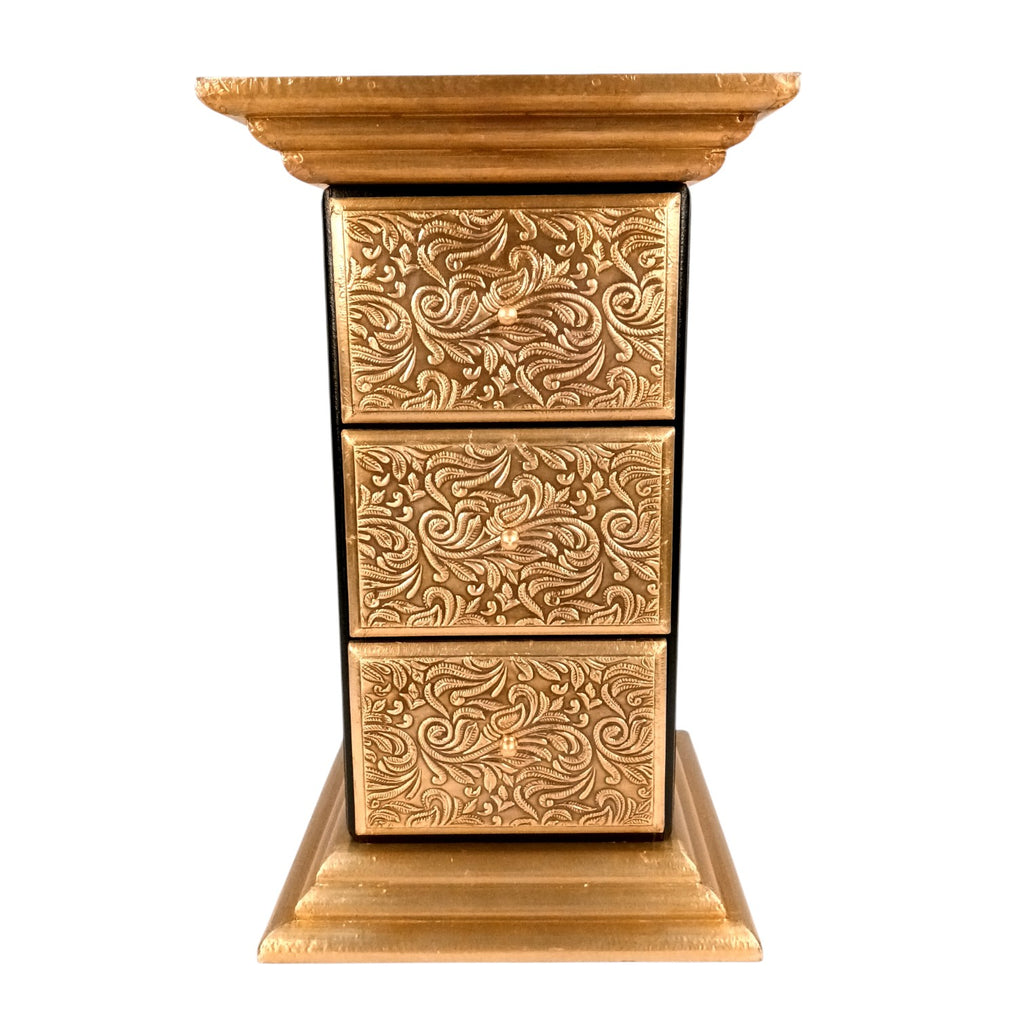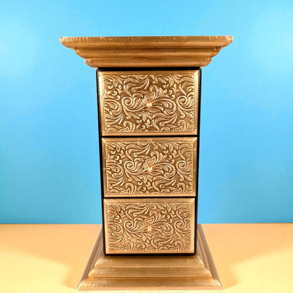Enhance your interiors with the timeless charm of the Pillar 3 Drawers Side Table by Apka Mart The Online Shop. Crafted from premium-quality wood and finished in a luxurious gold tone, this 18-inch side table is the perfect blend of traditional design and functional storage. Its elegant pillar-style structure and compact size make it an ideal addition to your living room, bedroom, hallway, or office décor.