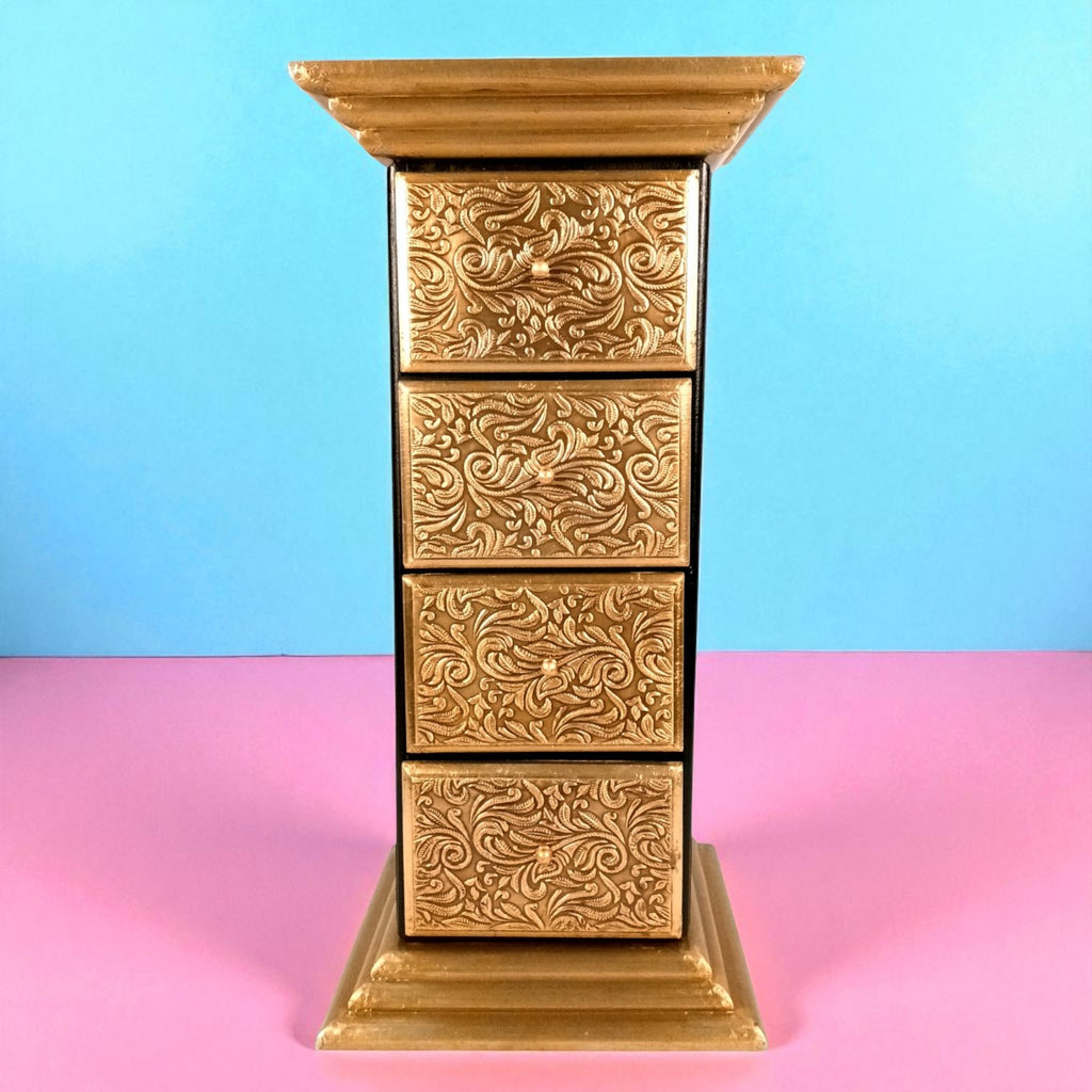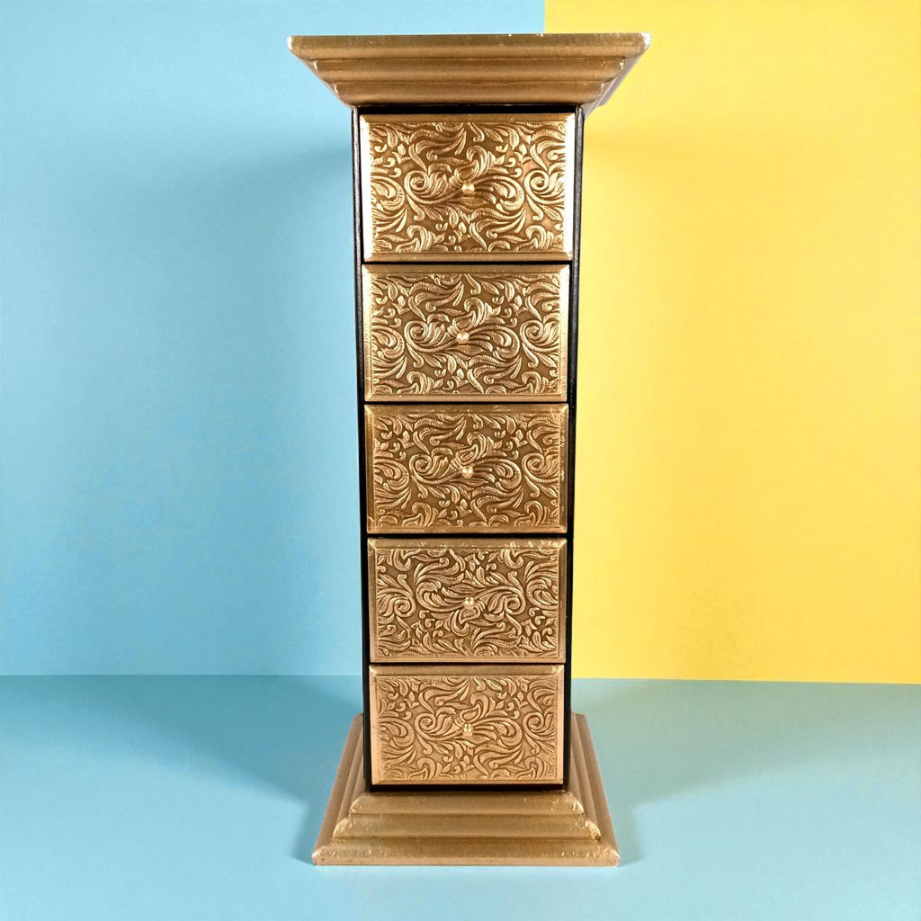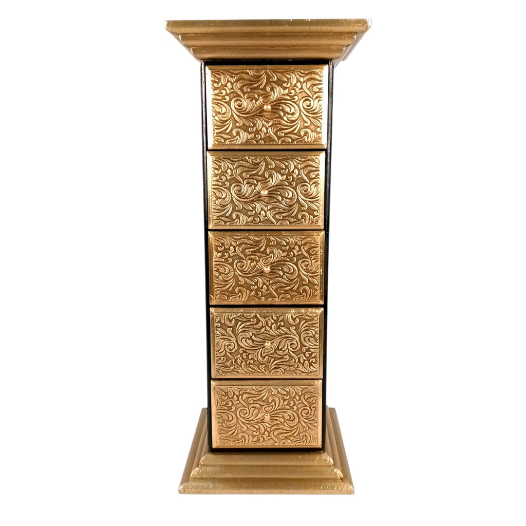 Elevate your interiors with the Pillar 5 Drawers Side Table from Apka Mart The Online Shop — a striking blend of traditional design and modern functionality. Standing tall at 27 inches, this elegant wooden side table adds charm and sophistication to any living room, bedroom, or office space. Handcrafted from high-quality wood and finished in a luxurious gold tone, it serves as a versatile accent furniture piece while offering ample storage for your daily essentials.