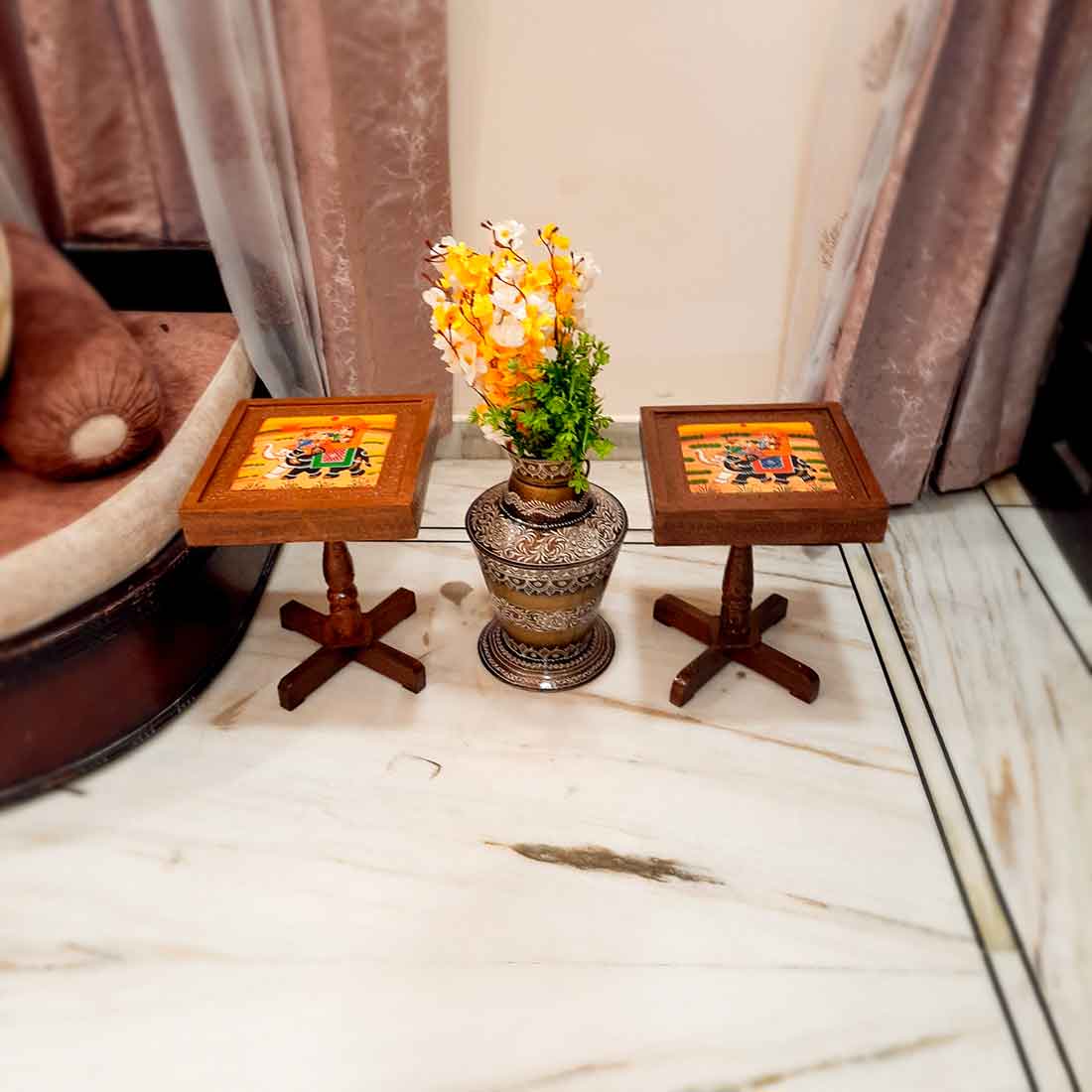 Our ‘By-Your-Side’ is a series that delivers beauty in the form of side and corner tables that are rich in Indian art and culture. This series is specifically designed to create a décor that is rich in colours and elegance. Made from wood, this set of two tables will bring the best to your home décor in terms of tea and coffee tables. These are painted with a brown shiny and glossy tint. These tables are painted with Indian ancient art on the top surface to give it a traditional touch and galore. The square top makes its design unique design and décorative. You can place these in your garden or living room to create your personalised coffee corner. They're also ideal for use as extra seating options when guests arrive, offering both style and functionality.