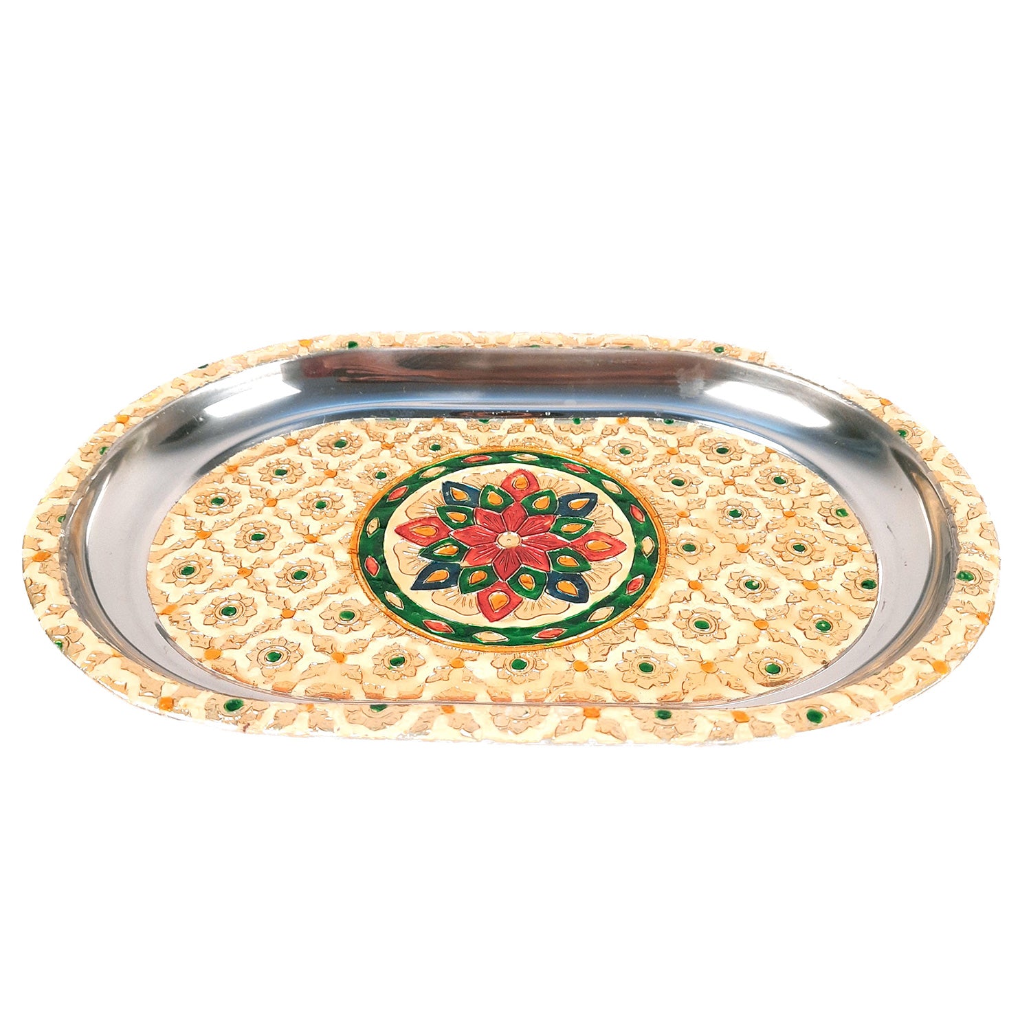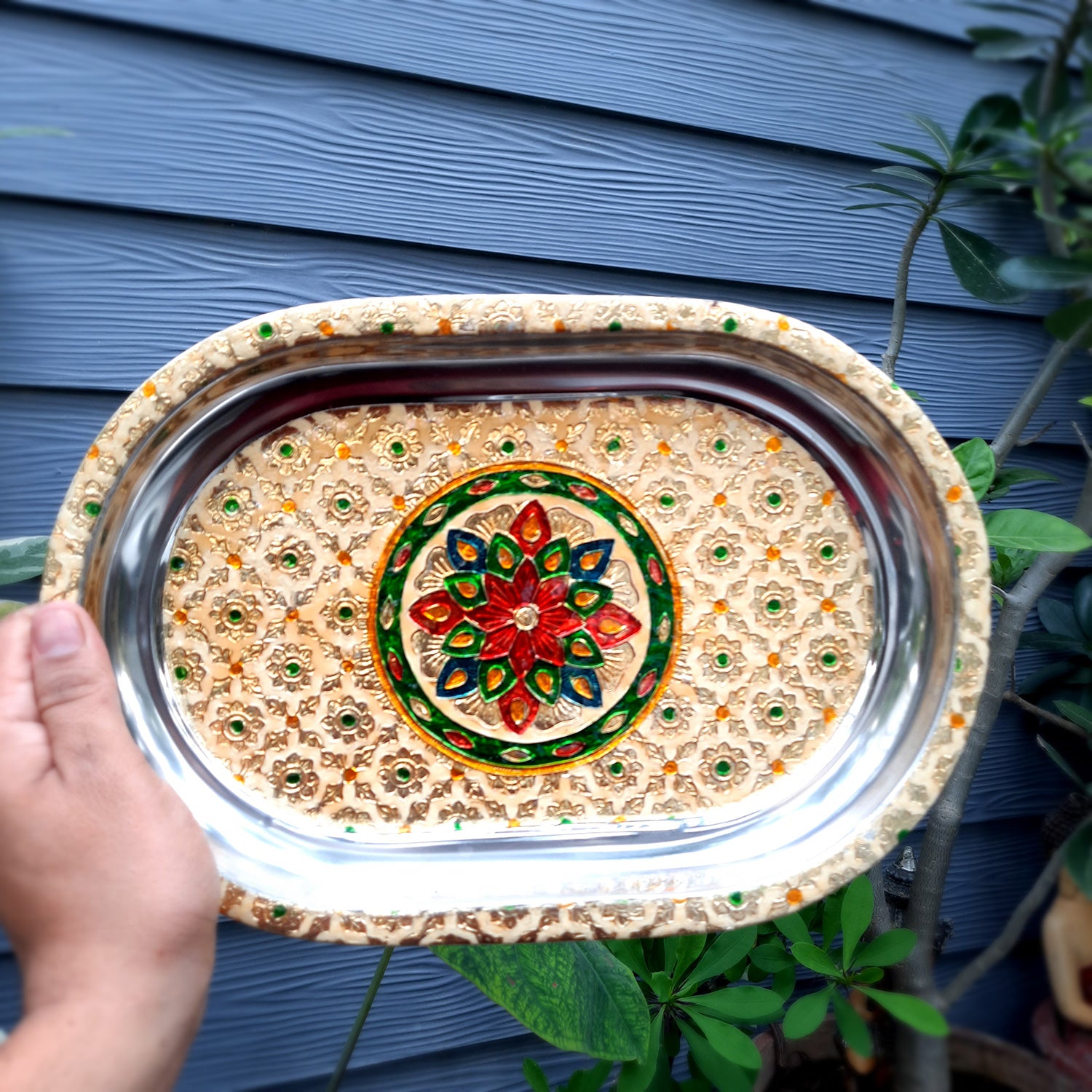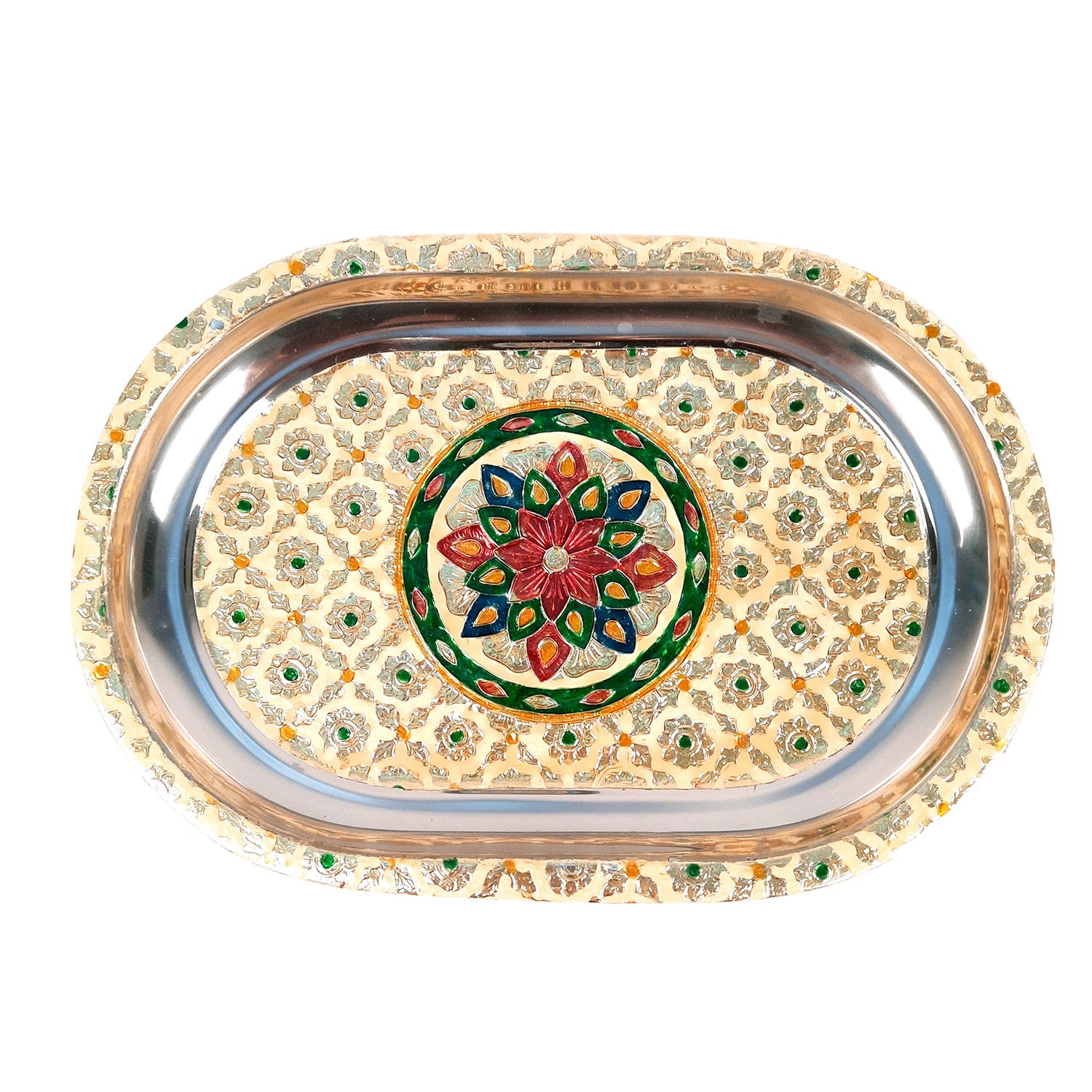 Presenting, a magnificently decorated serving tray, the most delicate item your kitchen could ever possess. This tray is so pleasing to the eye, you’d never guess it's a kitchen article. But we know your kitchen deserves the best just like the rest of your home, and so we bring to you this serving tray with flamboyant designs and carvings. The tray is adorned with flowery minakari style designs and bright coloured stones that perfectly complement it. Add to it a subtle background and you have the perfect tray. This kitchen article is just the right combination of utility and aesthetic. Because of its beauty, you can use it as a decorative tray for your dinner table, or your mantle piece or even as a tray for other pieces of decor you own. Imagine serving tea to your guests in a tray that trumps the appeal of the tea itself!