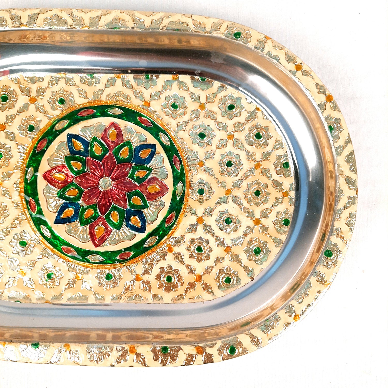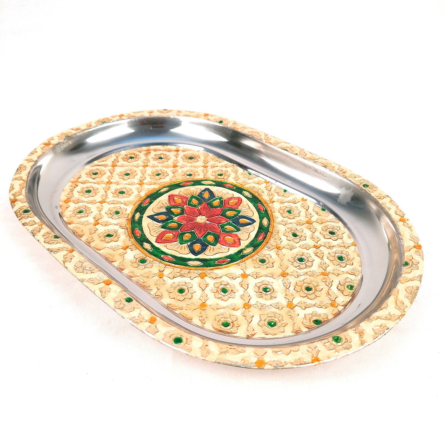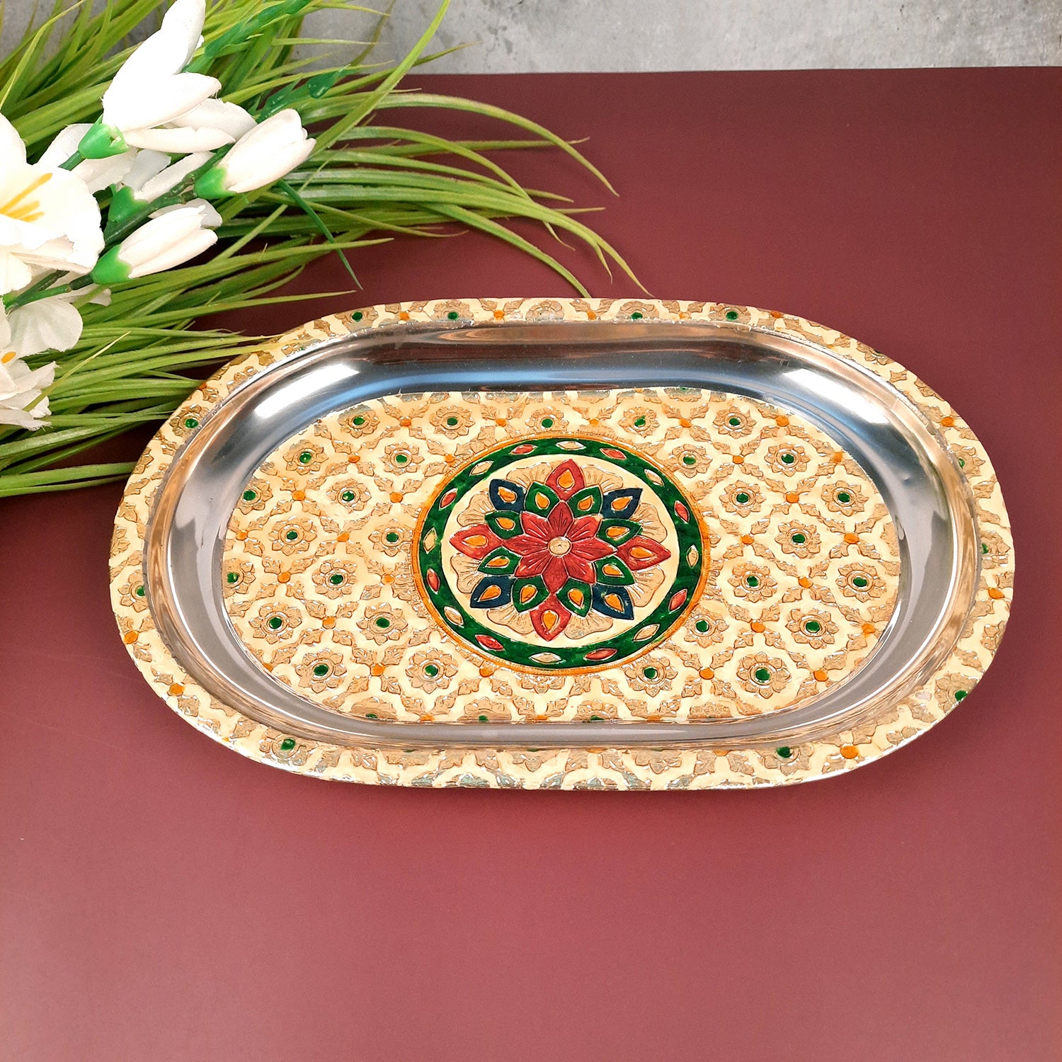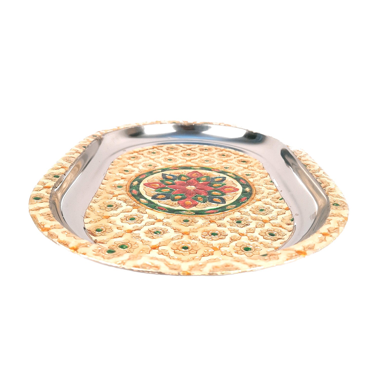 Presenting, a magnificently decorated serving tray, the most delicate item your kitchen could ever possess. This tray is so pleasing to the eye, you’d never guess it's a kitchen article. But we know your kitchen deserves the best just like the rest of your home, and so we bring to you this serving tray with flamboyant designs and carvings. The tray is adorned with flowery minakari style designs and bright coloured stones that perfectly complement it. Add to it a subtle background and you have the perfect tray. This kitchen article is just the right combination of utility and aesthetic. Because of its beauty, you can use it as a decorative tray for your dinner table, or your mantle piece or even as a tray for other pieces of decor you own. Imagine serving tea to your guests in a tray that trumps the appeal of the tea itself!