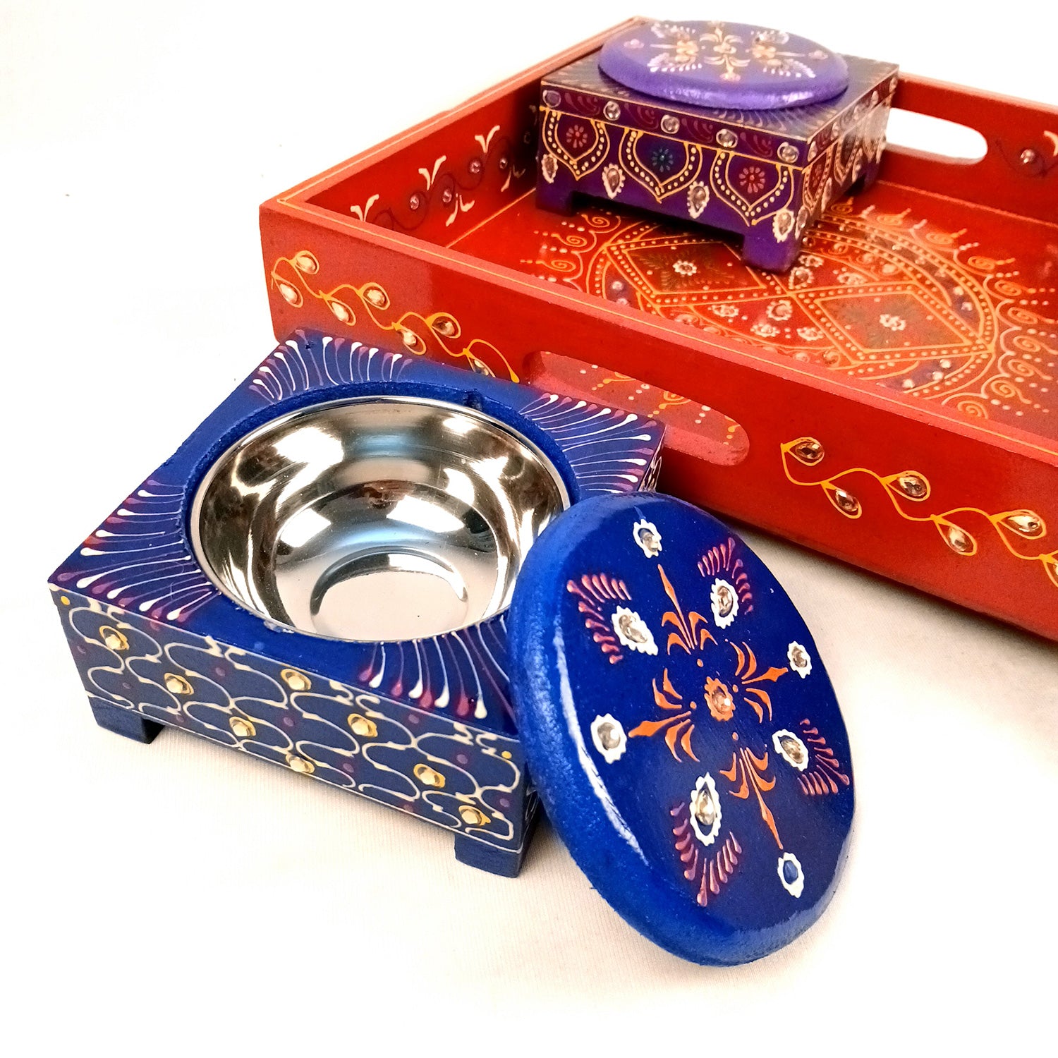Elevate your home decor and dining experience with this Wooden Serving Tray with Four Steel Bowls & Lid—a perfect blend of style, functionality, and versatility. Designed for serving snacks, dry fruits, and other appetizers, this beautifully crafted tray adds elegance to any table setting. Made from high-quality wood, the tray features a classic, polished finish, offering a sturdy and attractive base. The four steel bowls included are perfect for serving a variety of foods, from dry fruits to snacks, with a modern touch.