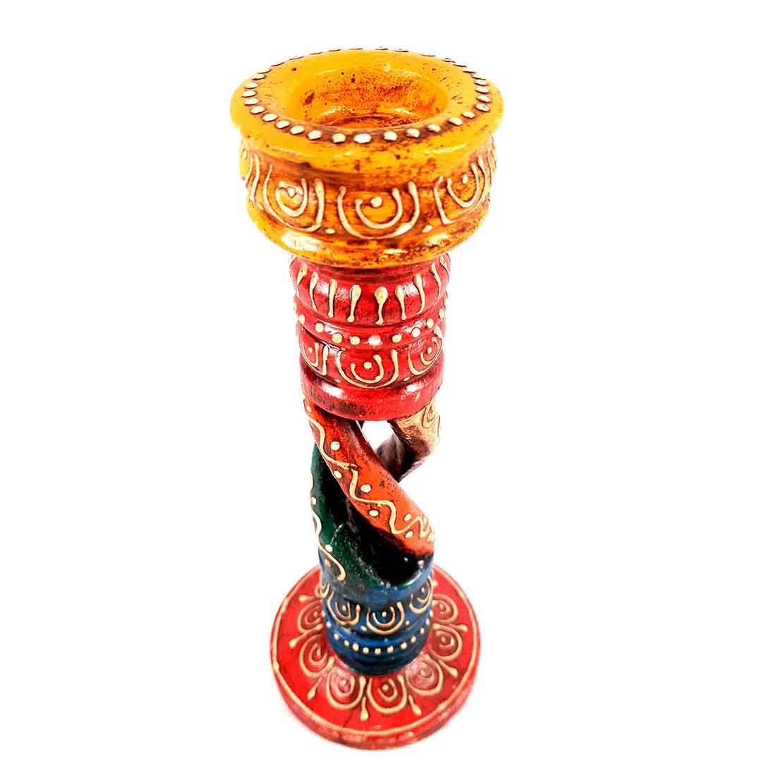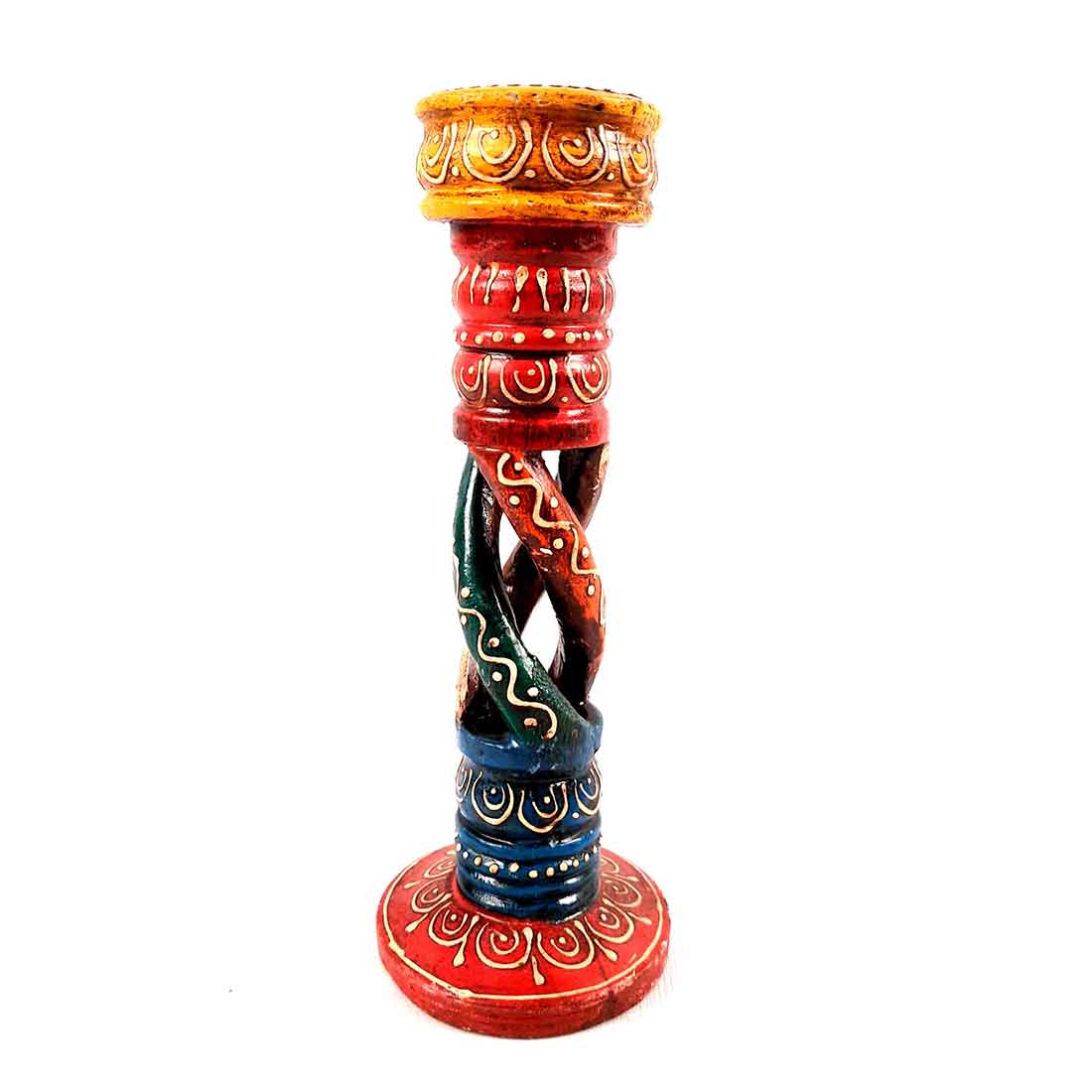 Candle stands are a great utility item. They also double up as a décor piece when it comes directly from Apkamart store. We bring this beautiful addition to your décor in the form of hand painted candle holders. Made of wood, this candle stand has a unique entangled design form. It represents the mixing of light and dark, the two truths of life. It is beautifully painted in vivid colours to give it a unique look. The colours bring light to your décor in their own way. You can place a single candle in the slot provided and hence have it ready whenever it is dark around you. You can club it with different sizes of candle stands and present it to someone you love and adore. It’s a perfect piece to be kept beside your bed or on the corner table.